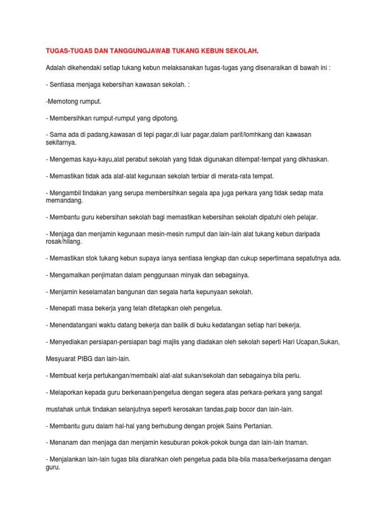 Keperluan parit ladang ini berbeza-beza mengikut jenis tanah jenis tanaman tujuan sistem perparitan ini. Documents similar to senarai tugas pekerja pembersihan tukang kebun. Pelajarilah tentang menjaga kebun binatang sebagai sebuah karier.