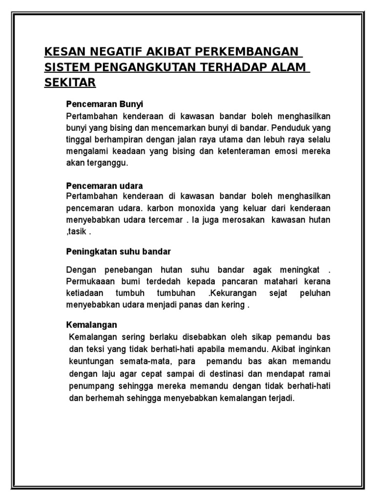 Kesan Negatif Akibat Perkembangan Sistem Pengangkutan Terhadap Alam Sekitar Pdf